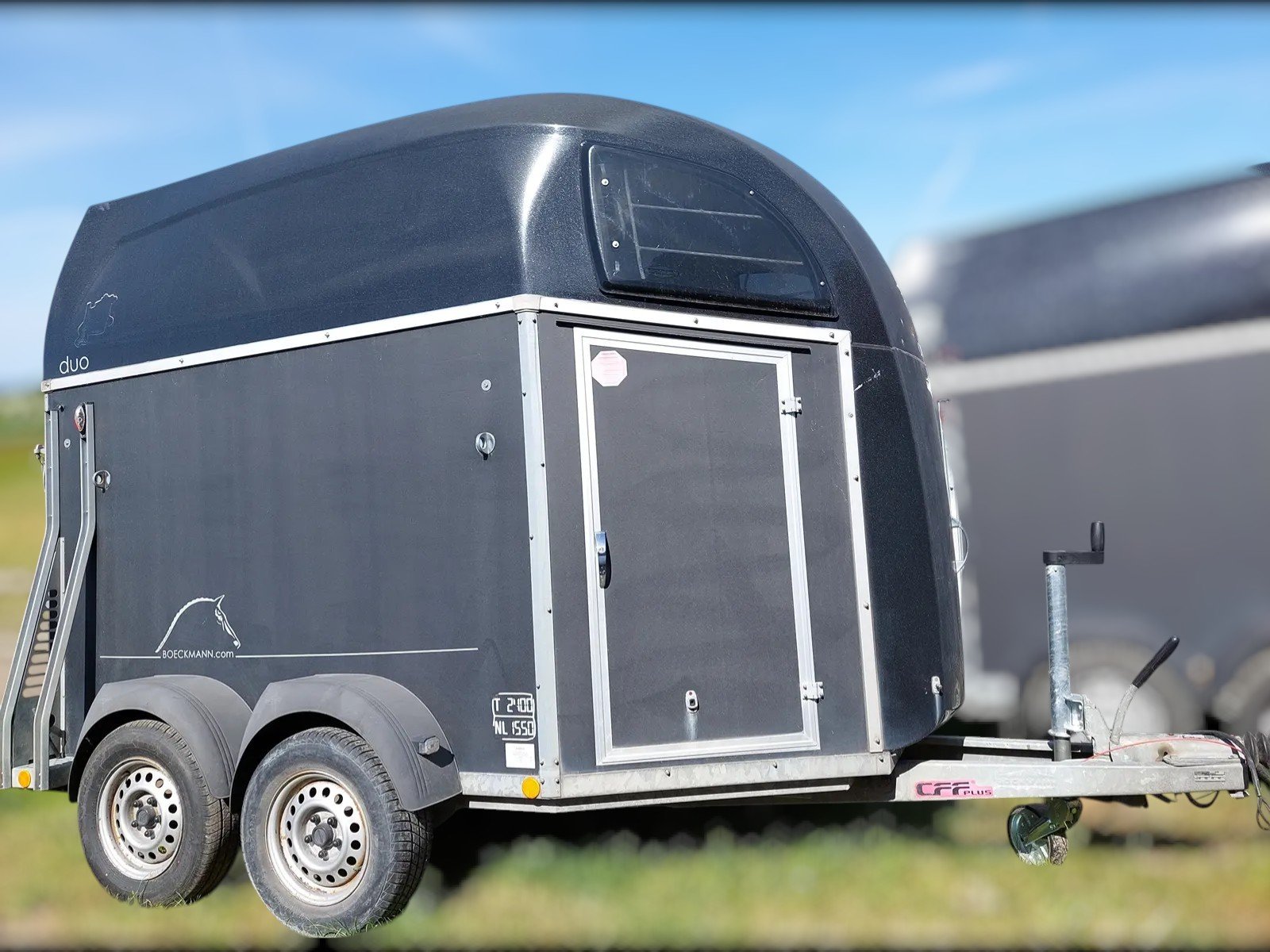 Stilren og stabil 2-hestes trailer med sadelrum og god plads ideel til sikker og komfortabel transport.