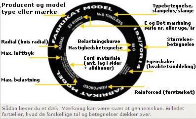 På siden af et dæk står en masse informationer, der beskriver dækkets egenskaber.