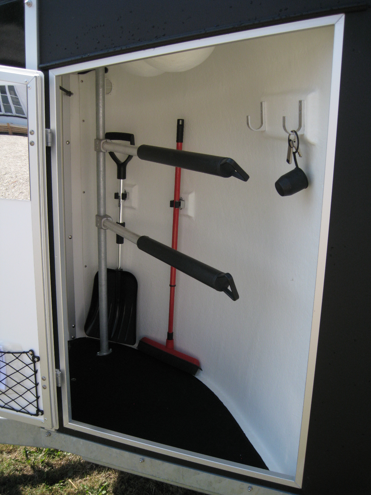 - Dørnet, spejl på dør, skovl med skaft og kost med teleskopskaft