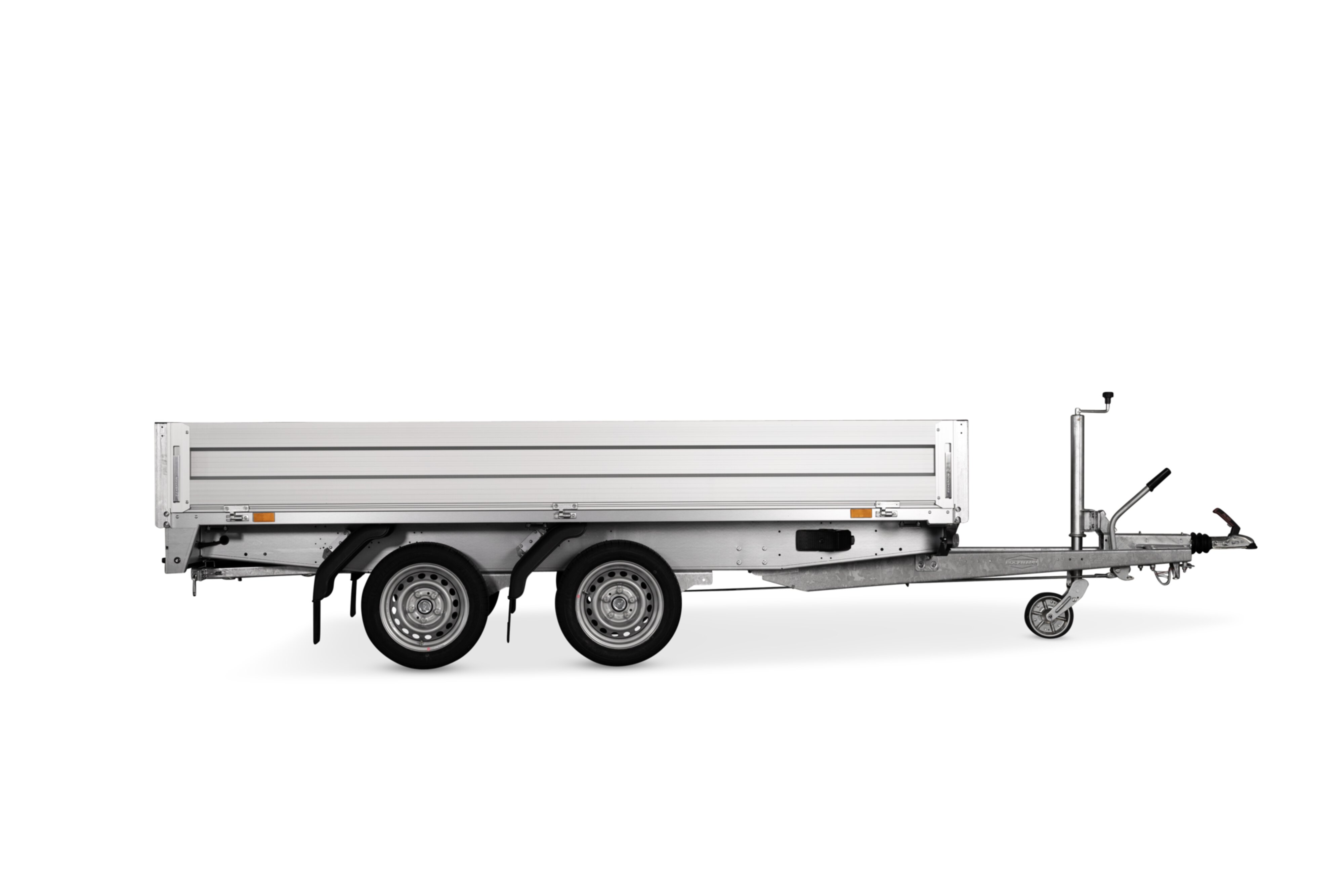 En robust og rummelig alu-høj-ladstrailer med lav læssehøjde, der gør læsning og aflæsning nemmere og mere effektiv. Perfekt til transport af materialer, maskiner og udstyr, hvor både styrke og lav lastningshøjde er en fordel.