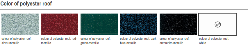 - Polyestertaget fåes i farverne: anthracite-metallic, silver-metallic, dark blue-metallic, green-metallic, red-metallic og hvid.